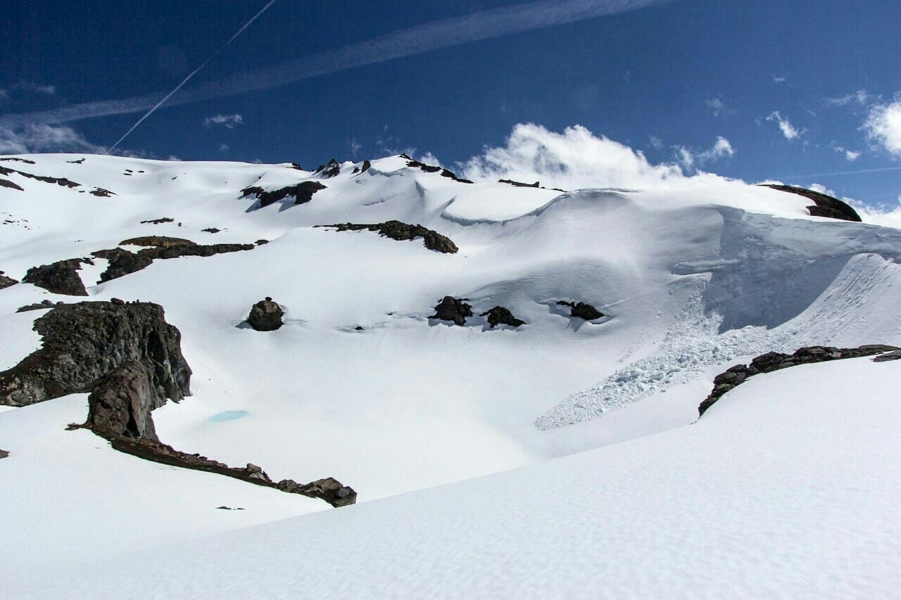 Usamos raquetas a partir de então até chegar no mirante, quase cume do Vulcão. O cume verdadeiro é de difícil acesso e não tem muita diferença do mirante. Foram 3h30min de caminhada.