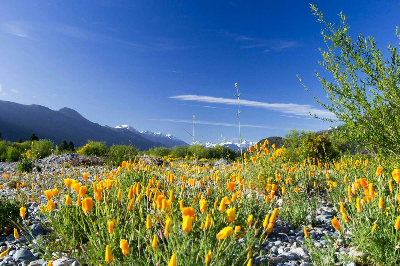 A passarela do Rio Puelo é linda, com muitas flores coloridas, amarelo, vermelho, lilás. Vale a pena a vista. E é de fácil acesso. Fica ao lado da rodovia que liga as cidades Lago Puelo e El Bolsón.
