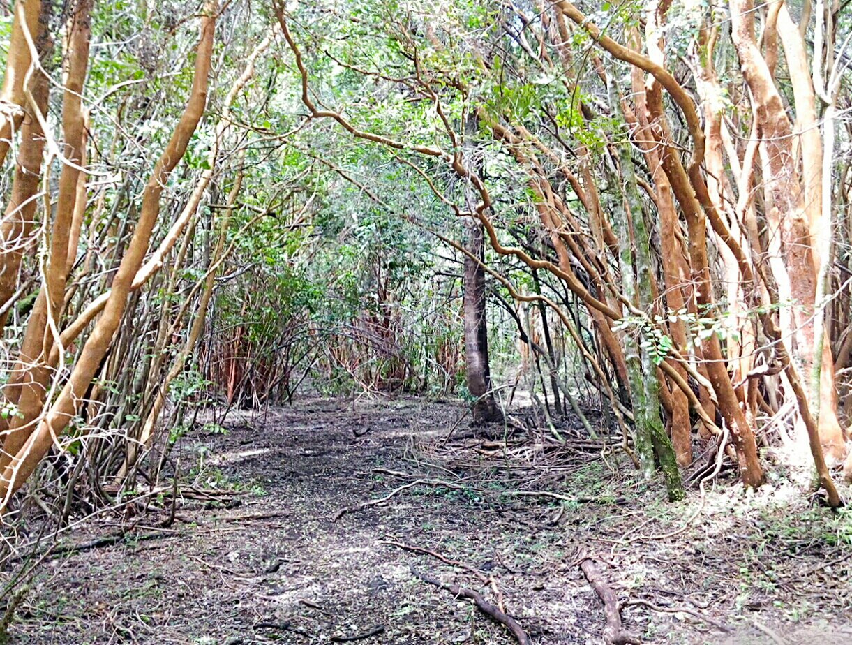 Passamos por uma praia onde deve funcionar um camping na alta temporada. E depois a trilha fica mais estreita com árvores de troncos alaranjados.
