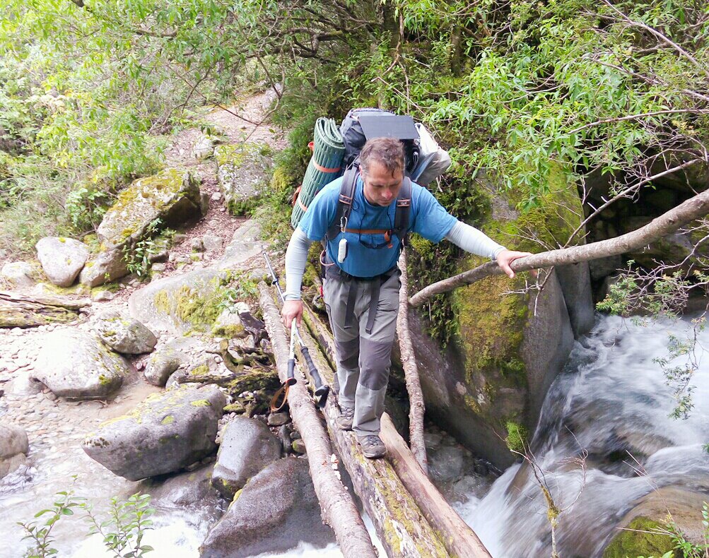 Há alguns riachos para cruzar e em três deles tivemos que tirar as botas para não molhá-las. Mas nada assustador. A água batia nas canelas. Nos outros riachos tínhamos ajuda de pedras e troncos de árvores.