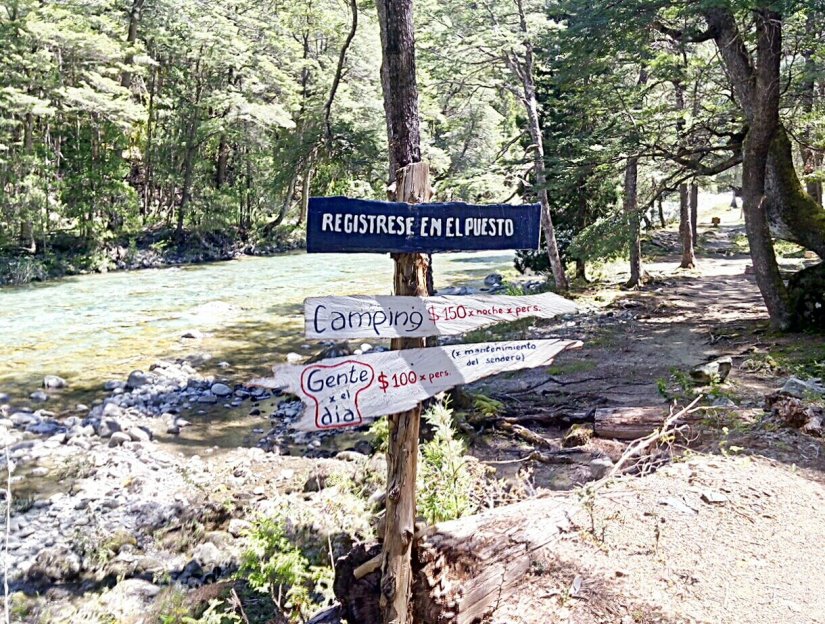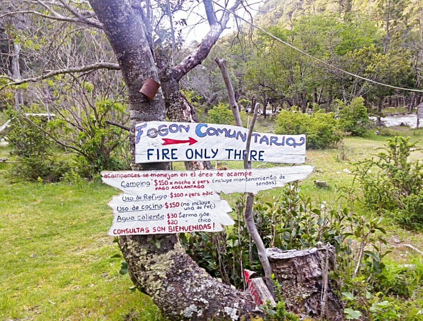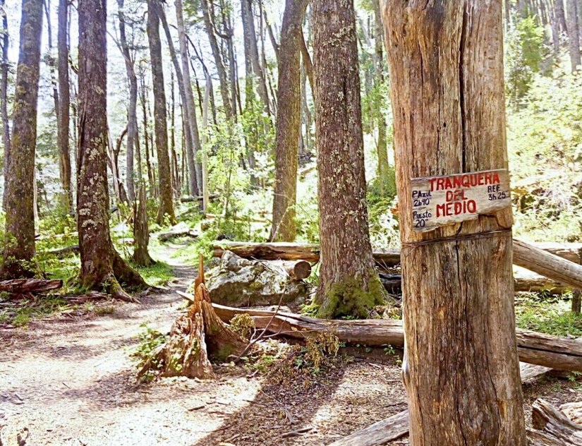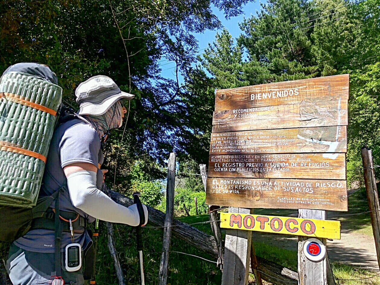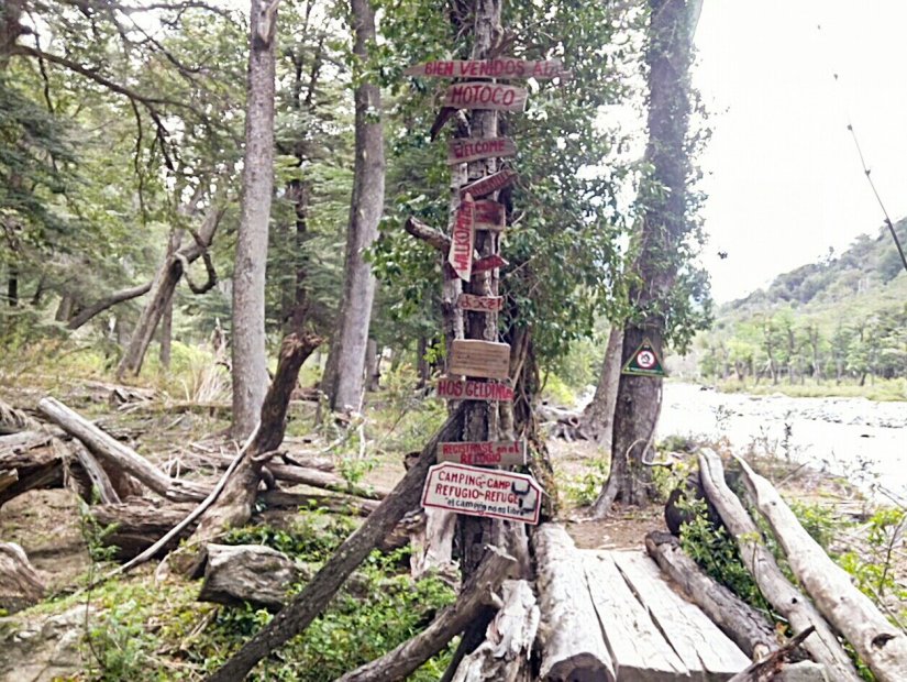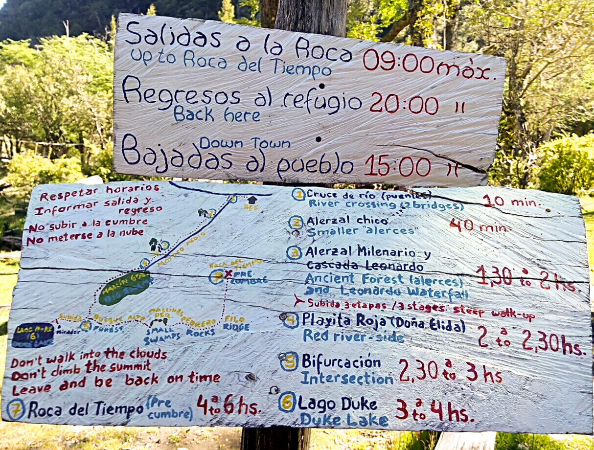 Em todo o percurso placas indicam quanto falta para chegar no refúgio Motoco e quanto já andamos desde a Passarela do Lago Puelo.