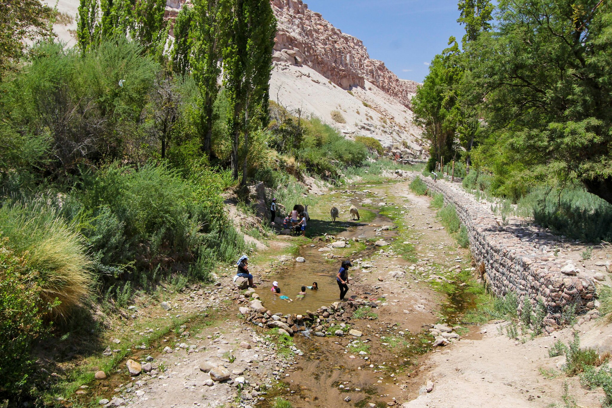 É permitido o banho no rio. Alguns chilenos aproveitavam o calor para se refrescarem em família.