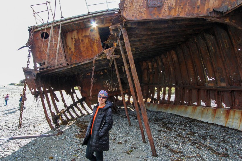 Chegamos às 18h10min no continente e passamos pela baía San Gregorio, onde há algumas construções abandonadas e os restos do primeiro barco a vapor da região de Magallanes, o “Amadeo”.