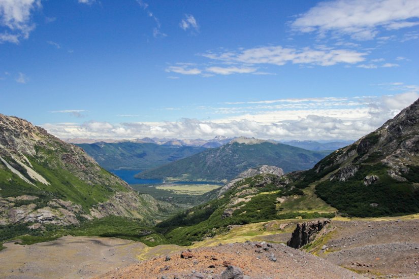 Atrás uma bela vista do vale, lagoa e mais montanhas.
