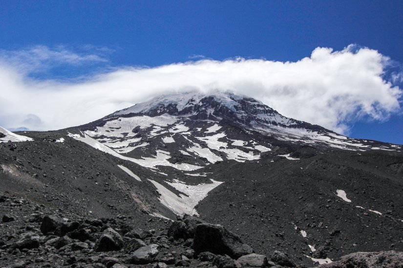 Andamos um pouco mais para ter uma vista mais próxima. Infelizmente neste dia o cume do vulcão estava encoberto por nuvens, mas mesmo assim deu para sentir sua grandiosidade.