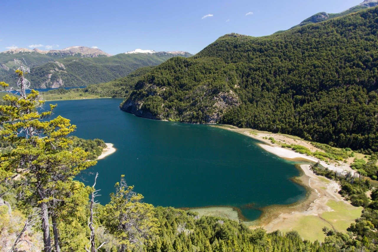 Bela paisagem com vista para os lagos Menéndez, Rivadavia e Futalaufquen, além do rio Arrayanes. Várias montanhas no horizonte, reconhecemos as montanhas Mongote e Torrecilla com seu glaciar.