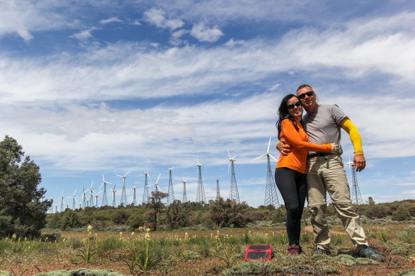 Seguimos pelo deserto molhado, passando ao lado de outro parque eólico. Imagem bonita da crista da montanha sendo desenhada pelos ventiladores gigantes.