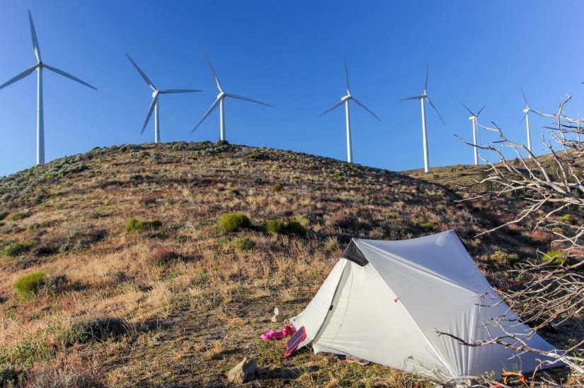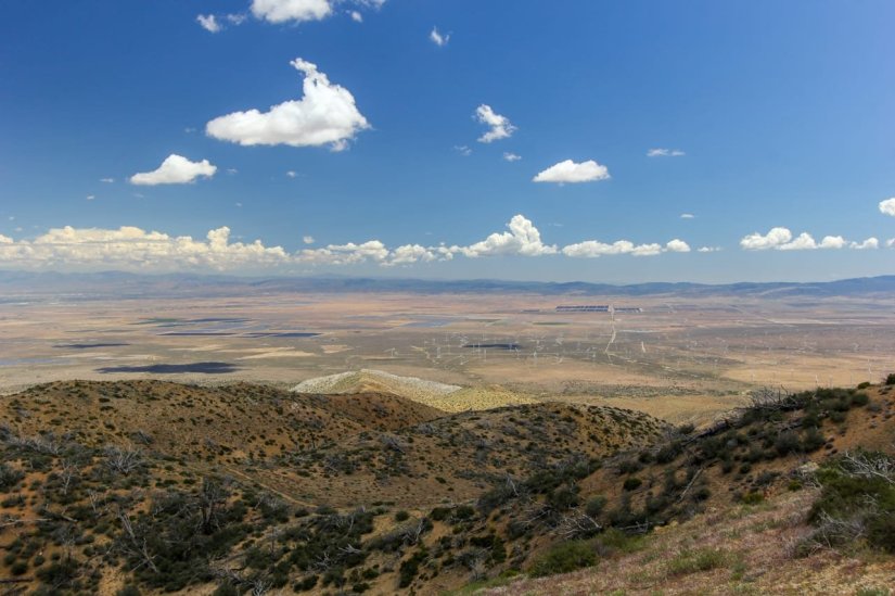 Depois do trail magic, vimos uma paisagem surpreendente do vale, com inúmeros eólicos, gigantes placas solares e uma cadeia montanhosa no horizonte.