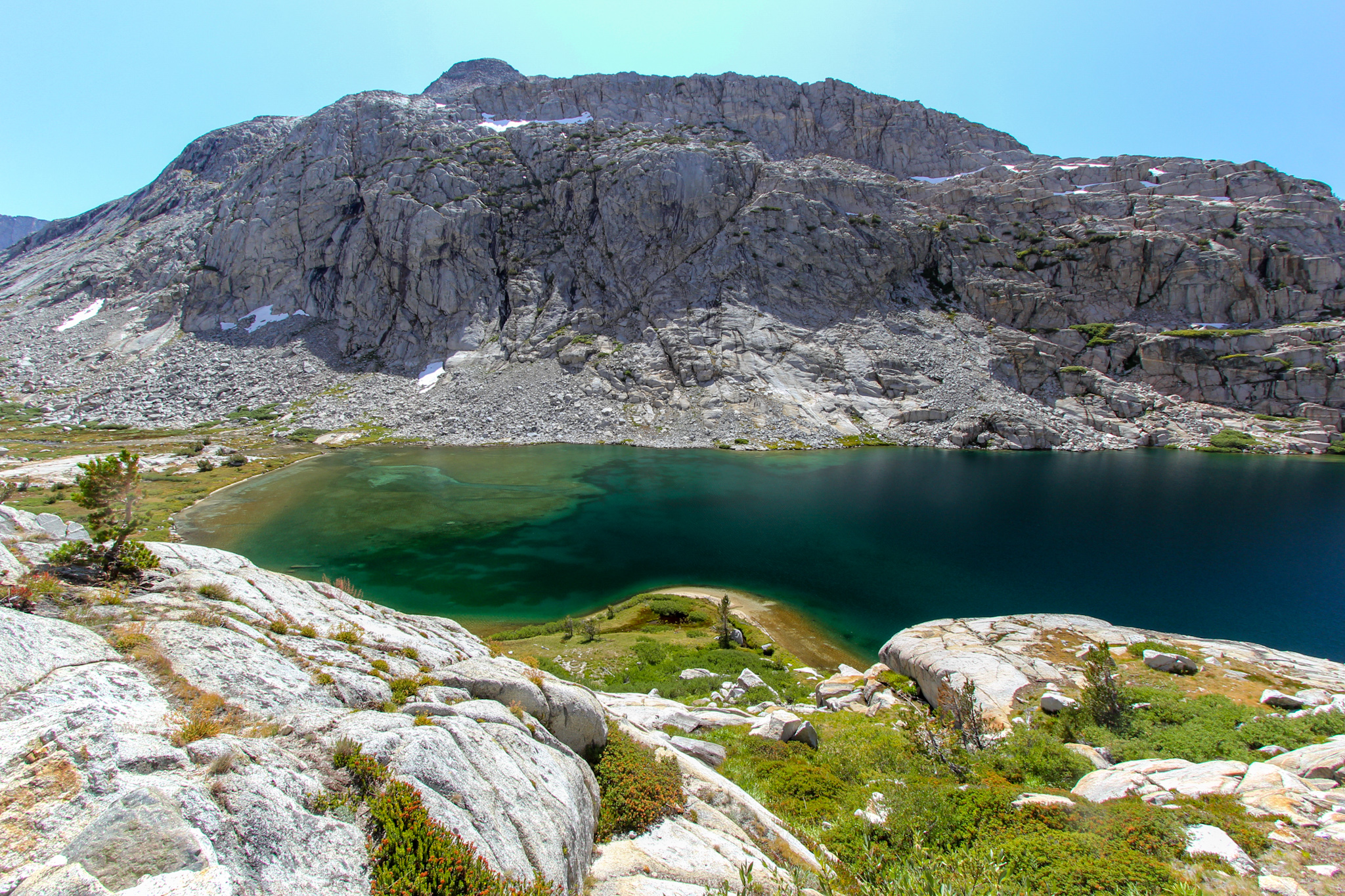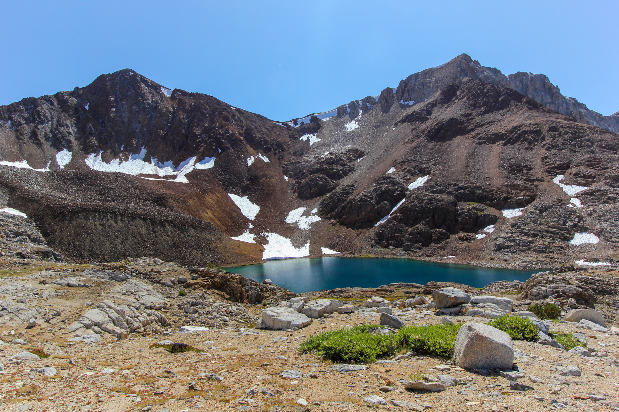 O Evolution Lake foi eleito o lago mais bonito da PCT até o momento. Um grande lago rodeado por montanhas rochosas nevadas e com uma boa área de acampamento ao redor. Não há palavras para descrevê-lo. Margeamos o Evolution Lake e continuamos subindo entre pedras.