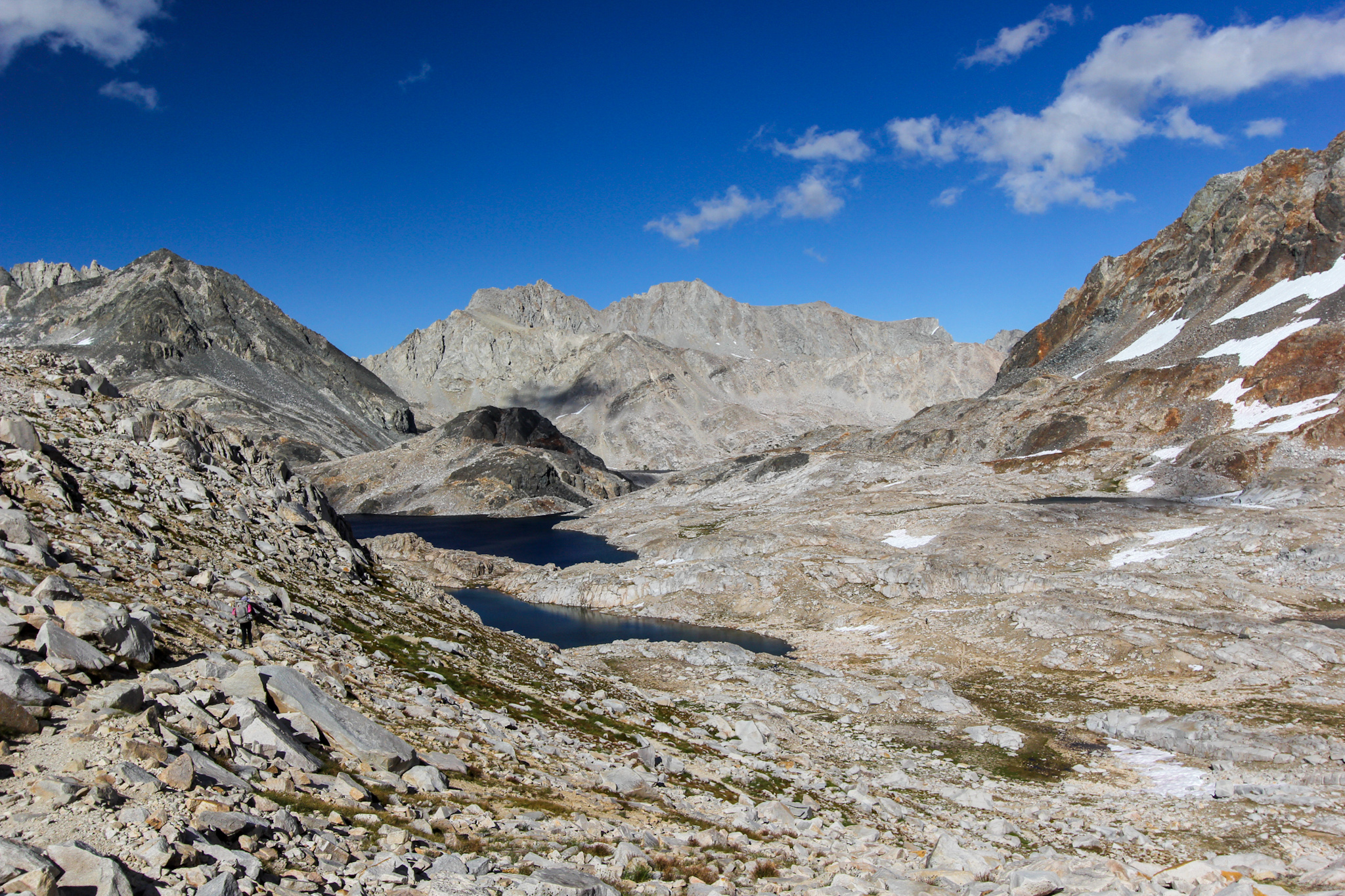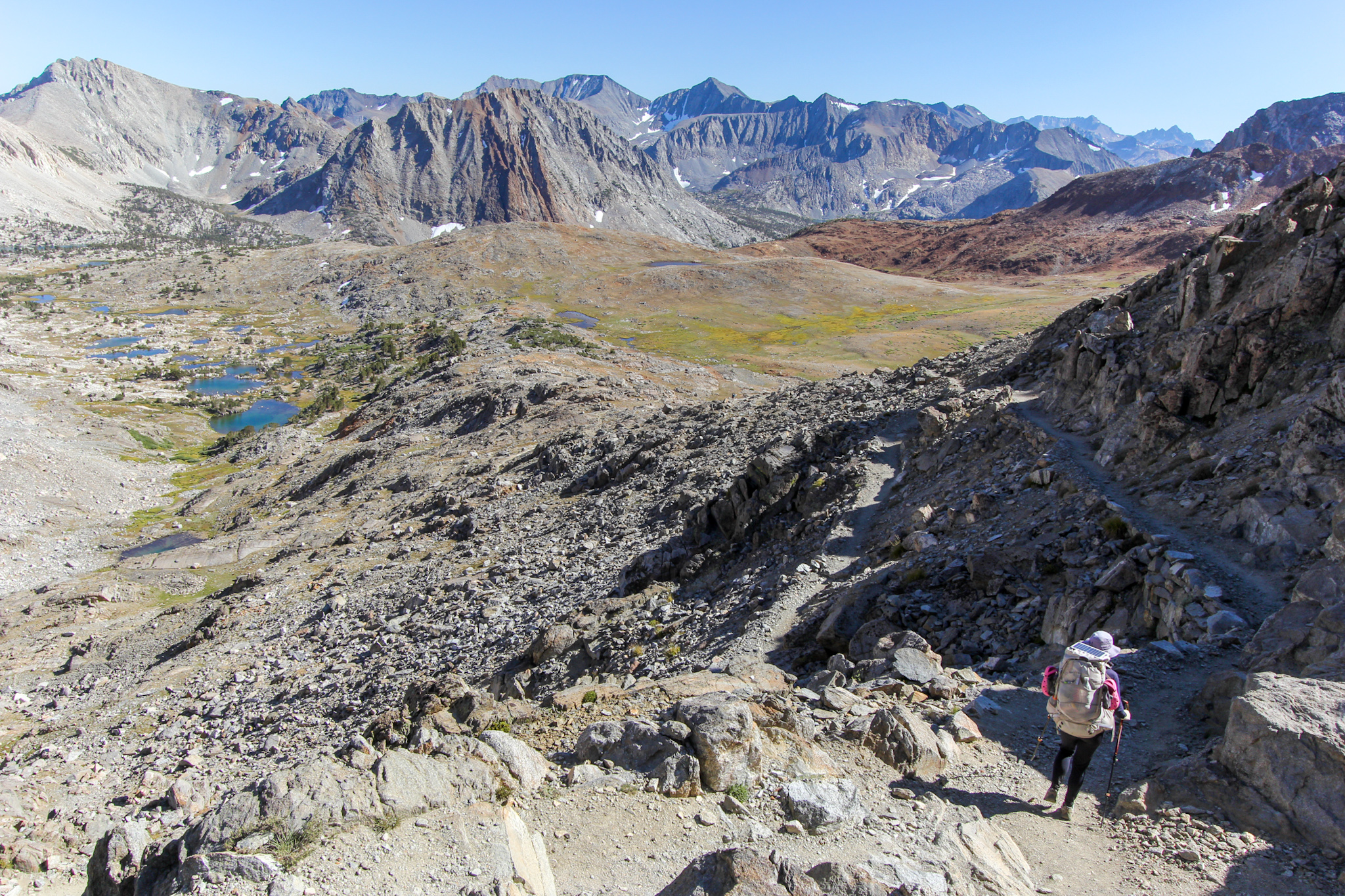 Saímos do Rae Lake e subimos até o Glen Pass. No caminho vários mini-lagos davam o ar da graça. E lá de cima do passo mais uma bela vista. Quantas lindas paisagens já vimos neste trecho! A John Muir Trail é realmente bela.