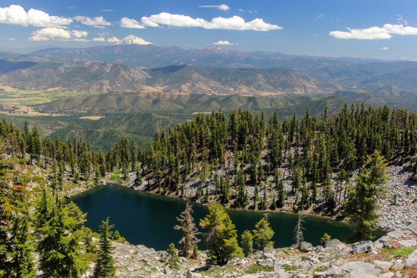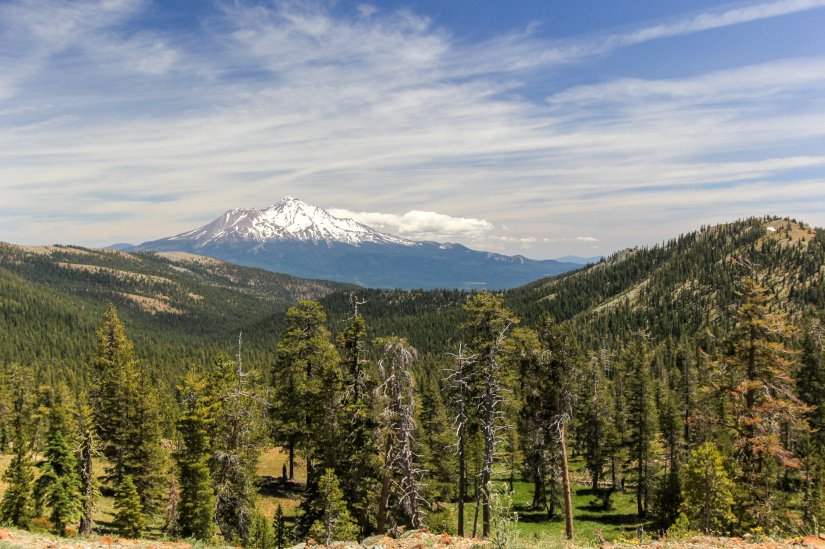 Caminhamos pelo Klamath National Forest, com belas paisagens de montanhas. Entre as montanhas, vimos o lago Smith e o pico nevado do Mount Shasta ao fundo.
