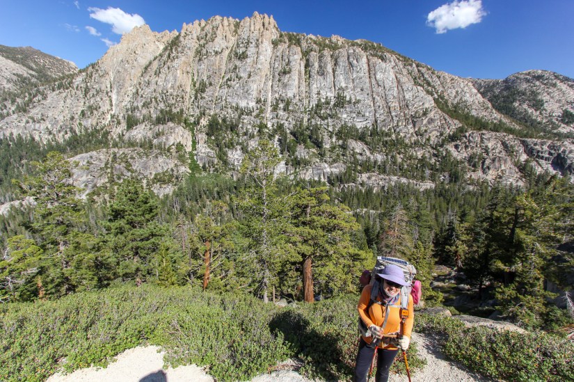 Passamos também pelo Reynolds Peak, outra parede de pedra e terminamos o dia ao lado do Sherrold Lake, com o Ebbetts Peak logo acima.
