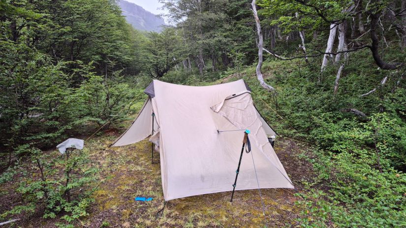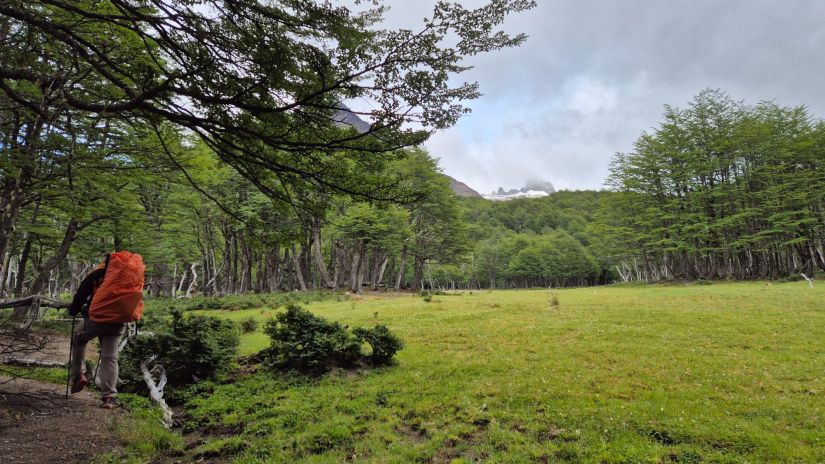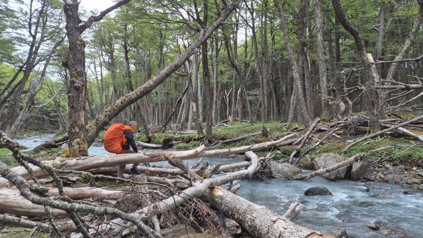Acordamos com uma névoa bem úmida, o suficiente para deixar a barraca molhada. Arrumamos nossas mochilas e logo nos primeiros passos atravessamos o primeiro riacho do dia. Foram vários riachos e córregos que nos acompanharam durante todo o dia. Seguimos acompanhando o Estero El Alto, passando pelo Mallin El Alto. Caminhamos dentro de um bosque. Ao chegarmos no Mallín Plaza, fizemos um pequeno desvio para conhecermos a Laguna La Plaza.