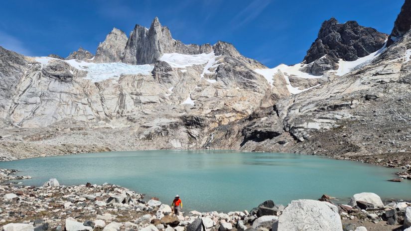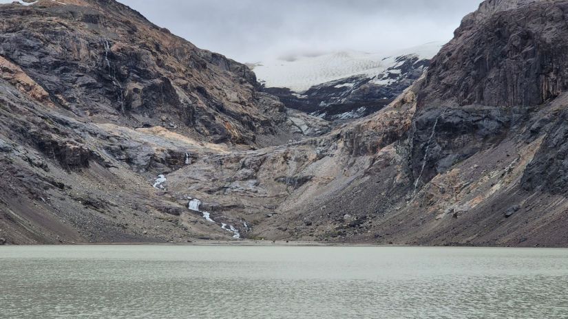 Antes, deixamos nossas mochilas em uma cabana em construção, e atacamos a laguna só com o celular. Era somente 1 km de desvio, 2 km ida e volta. A laguna tem uma água azul clara e pastosa. Atrás havia um glaciar, mas devido ao clima nublado não podemos ver muita coisa.