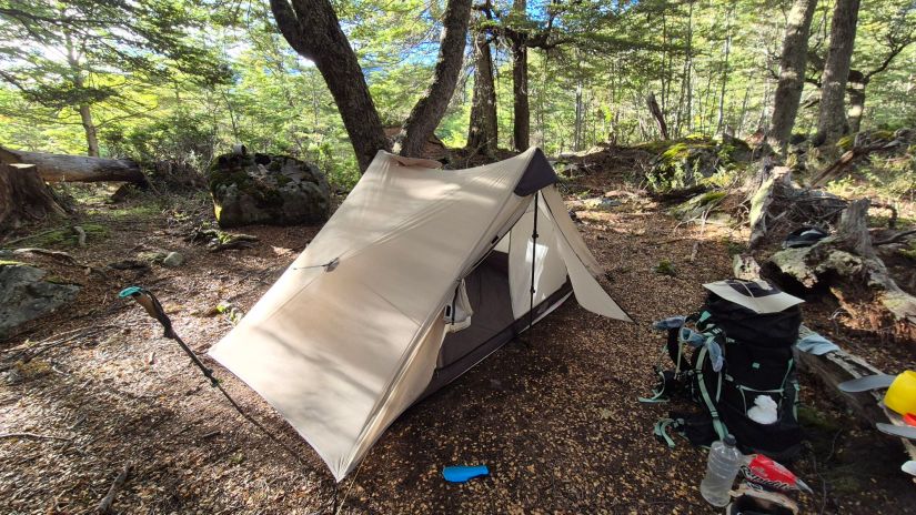 Descemos o paso para o outro lado e foi muito difícil. Não havia trilha. Caminhamos sobre pedras gigantes com todo o cuidado para não cairmos. Foi muito exaustivo. Ficamos umas duas horas caminhando assim. Até que decidimos não seguir o tracklog que tínhamos e adentramos na floresta. Foi bem mais fácil de caminhar. Assim fomos até retornamos para o tracklog dentro do bosque, onde logo encontramos um lugar para acampar.